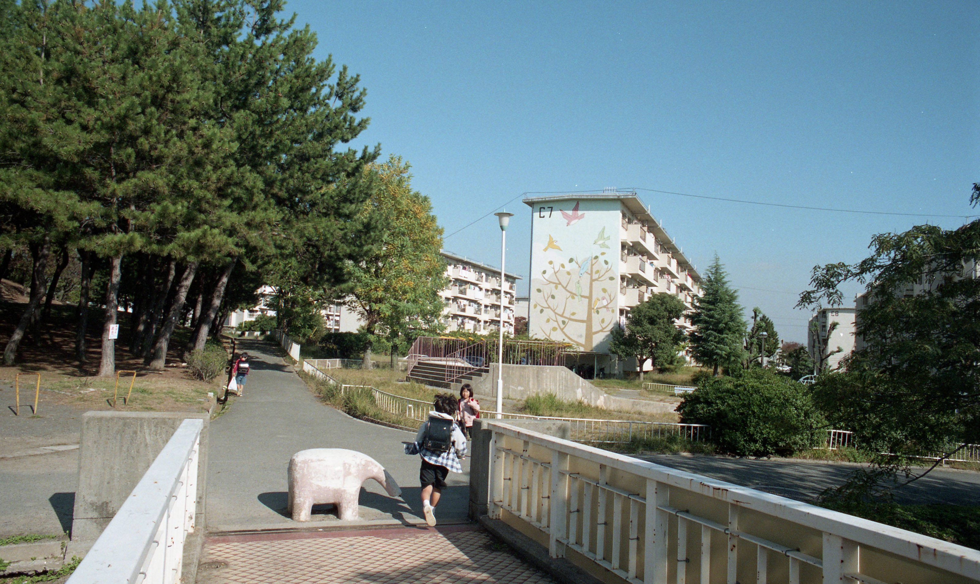 | 内容・説明 | 青山台。青山公園から近隣センター裏手に架かる歩道橋「やなぎ橋」。動物の車止めが見られる。奥の公団C7棟妻面には壁画が描かれている。公団の壁画はおもに、遊園(プレイロット)に面した場所に描かれ、子どもたちの目印になるよう考えられている。 |