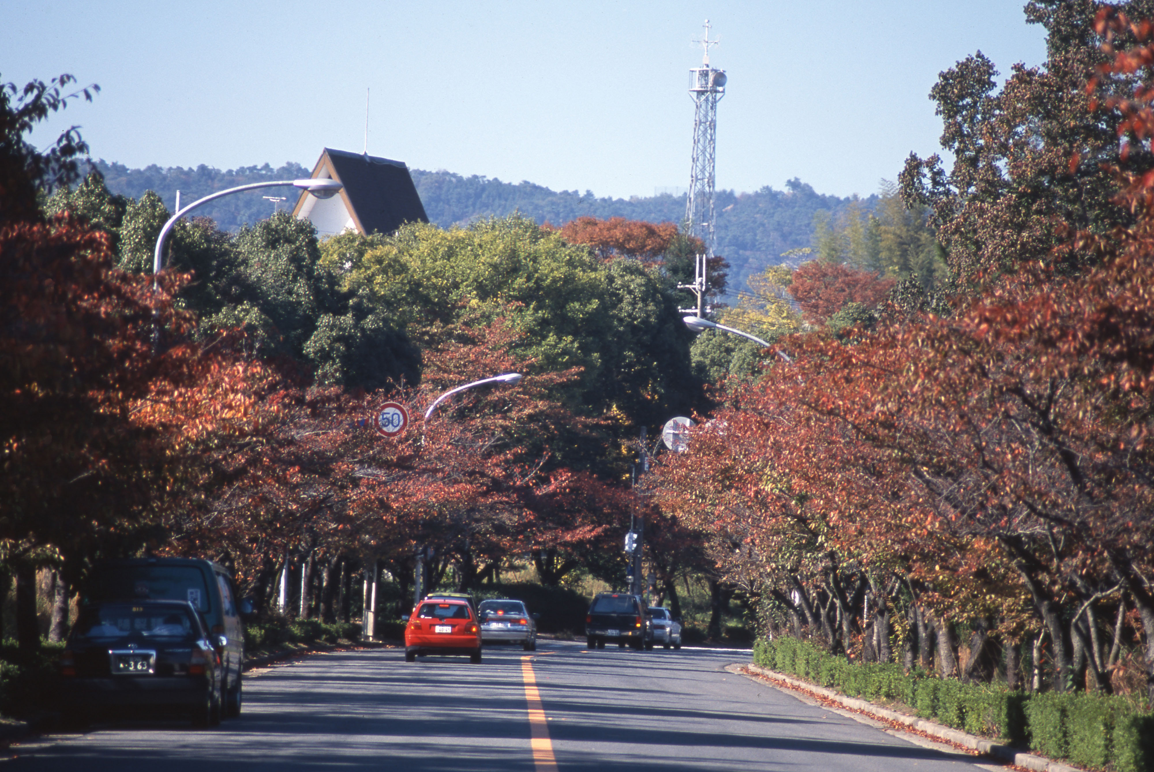 | 内容・説明 | 紅葉の(千里中央通→)千里さくら通り。左が豊中市新千里北町、右が吹田市青山台。(『ガーデンシティ千里ニュータウン』2002(平成14)年)10月発行に掲載) |