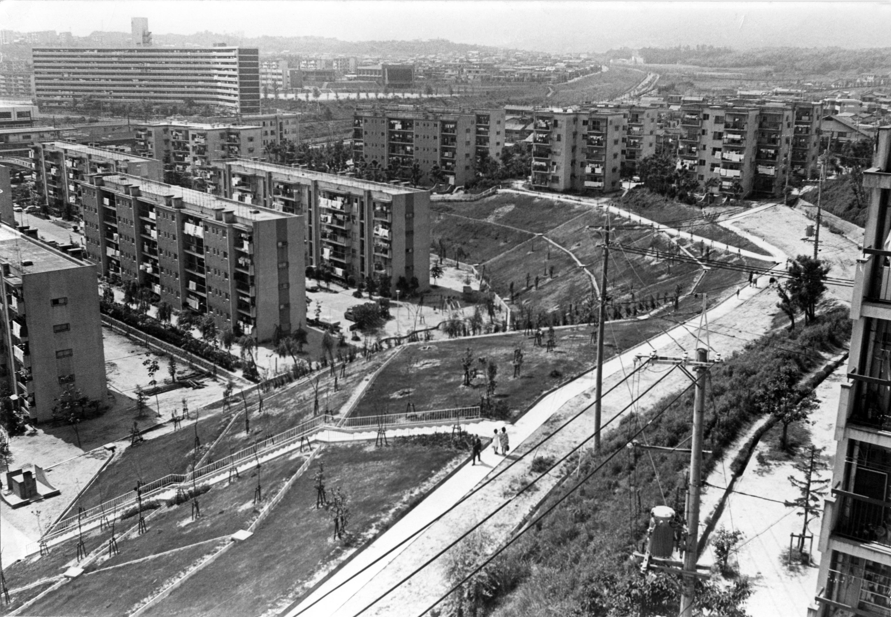 | 内容・説明 | 藤白台公社(千里丘陵G団地、藤白台B団地)敷地内。斜面が一次整備され、のちの「ふれあいの道」が完成。「三角公園」はまだ造られていない。青山台方面が見えている。 |
