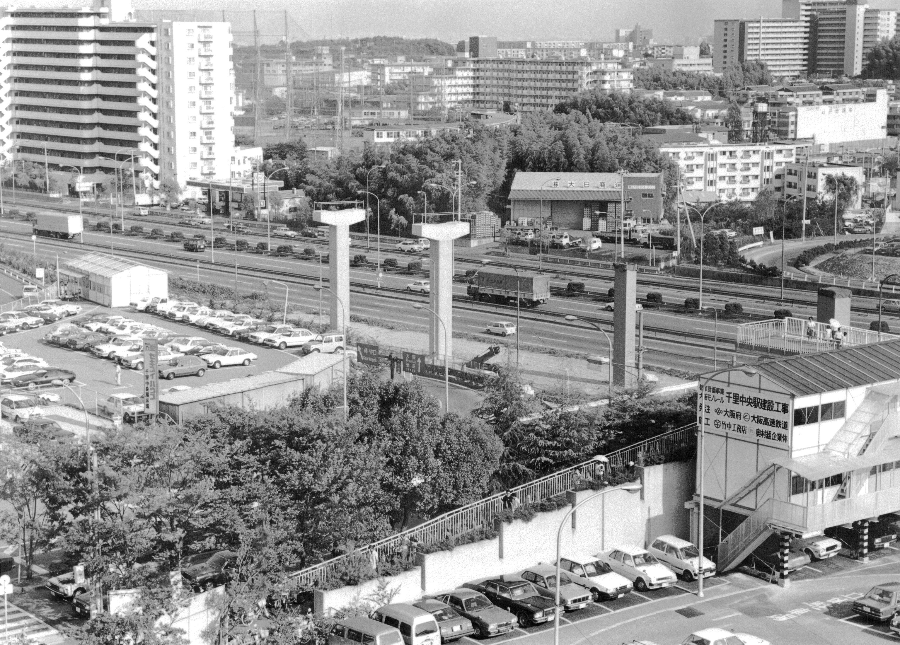 | 内容・説明 | 大阪モノレールの建設現場。千里中央の千里阪急ホテル前あたりを南東側に向けて(このあたりの中国道東行車線上に、北大阪急行の千里中央仮駅があった)。同モノレールは1982年に着工したが、南茨木 - 千里中央の開業まで8年を要し、大阪空港までの延伸にはさらに7年を要した。構想は万博以前にまでさかのぼる。 |