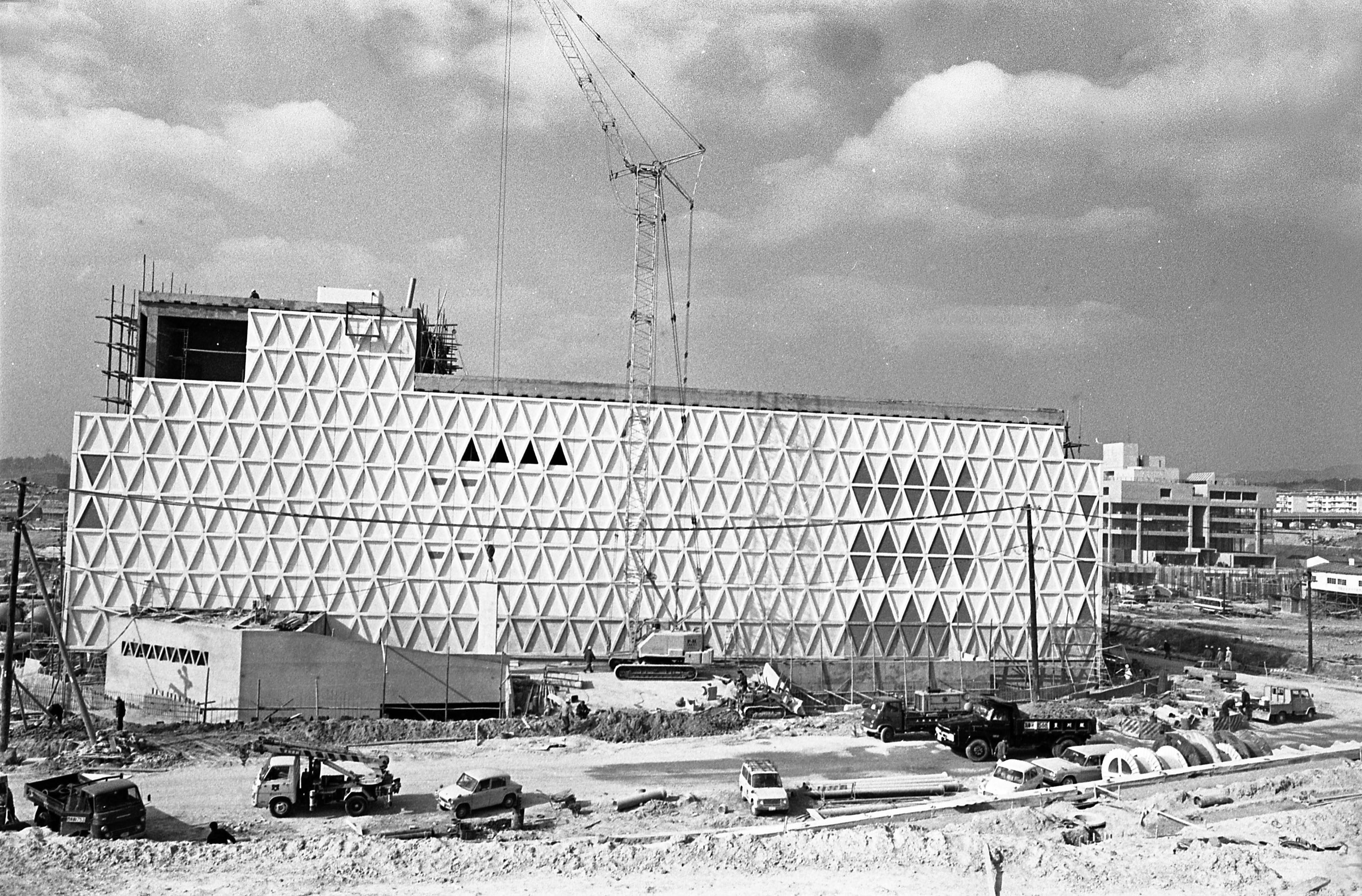 | 内容・説明 | 建設中の千里阪急(百貨店)。東面から見ている。郊外型店舗のはしりとして緑の壁に白いフレームの未来的な外観が採用されたが、この写真では真っ白に見える。緑はあとから色を入れていったのだろうか。 |