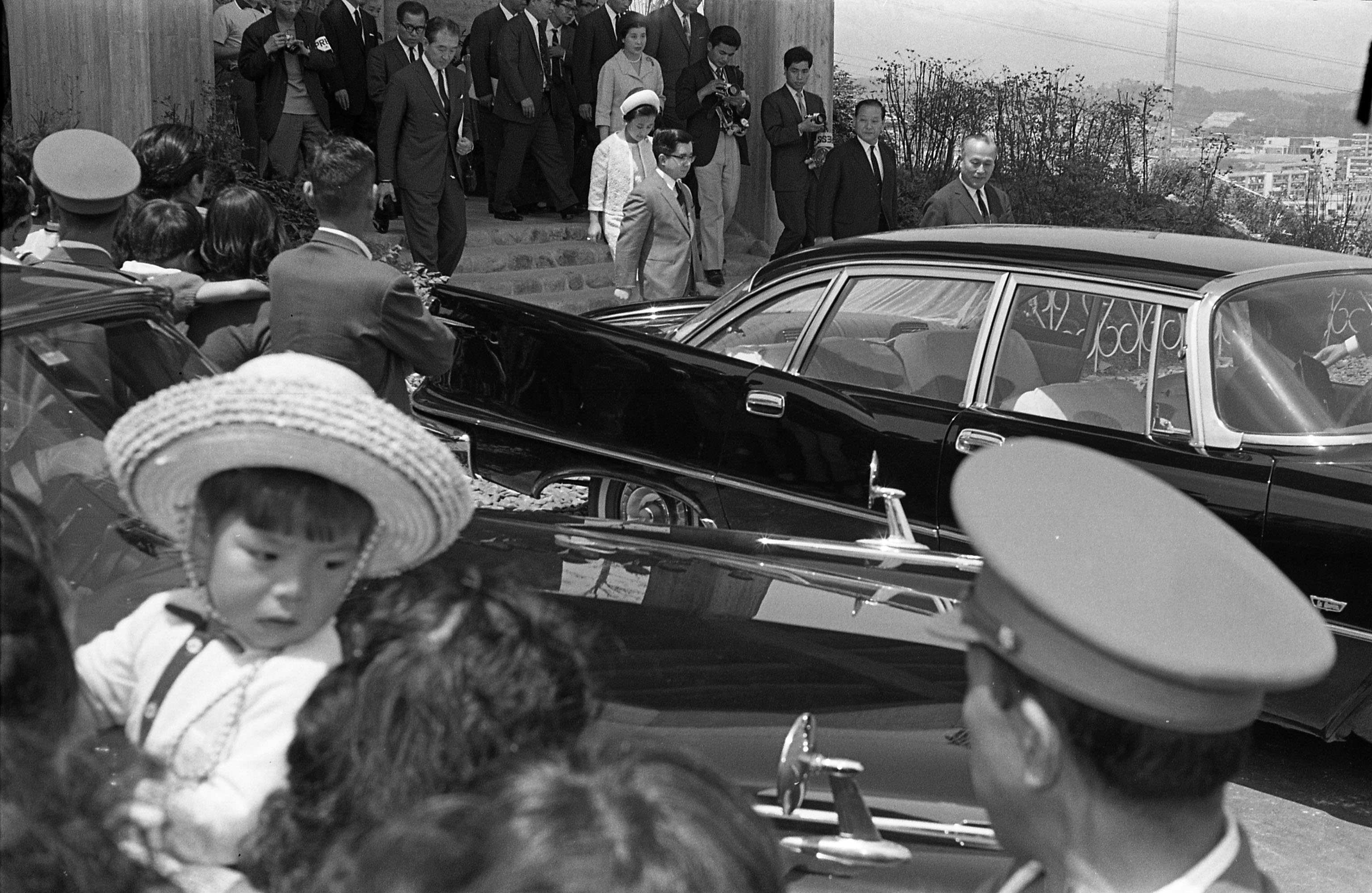 | 内容・説明 | 常陸宮様・華子妃ご来訪。千里中央公園の展望台下で。先導する左藤義詮大阪府知事の姿も見える。万博開催も決定し、展望台から万博予定地と開発が進むニュータウンを見ていただくのはVIP来訪時の「お決まりのコース」だった。 |