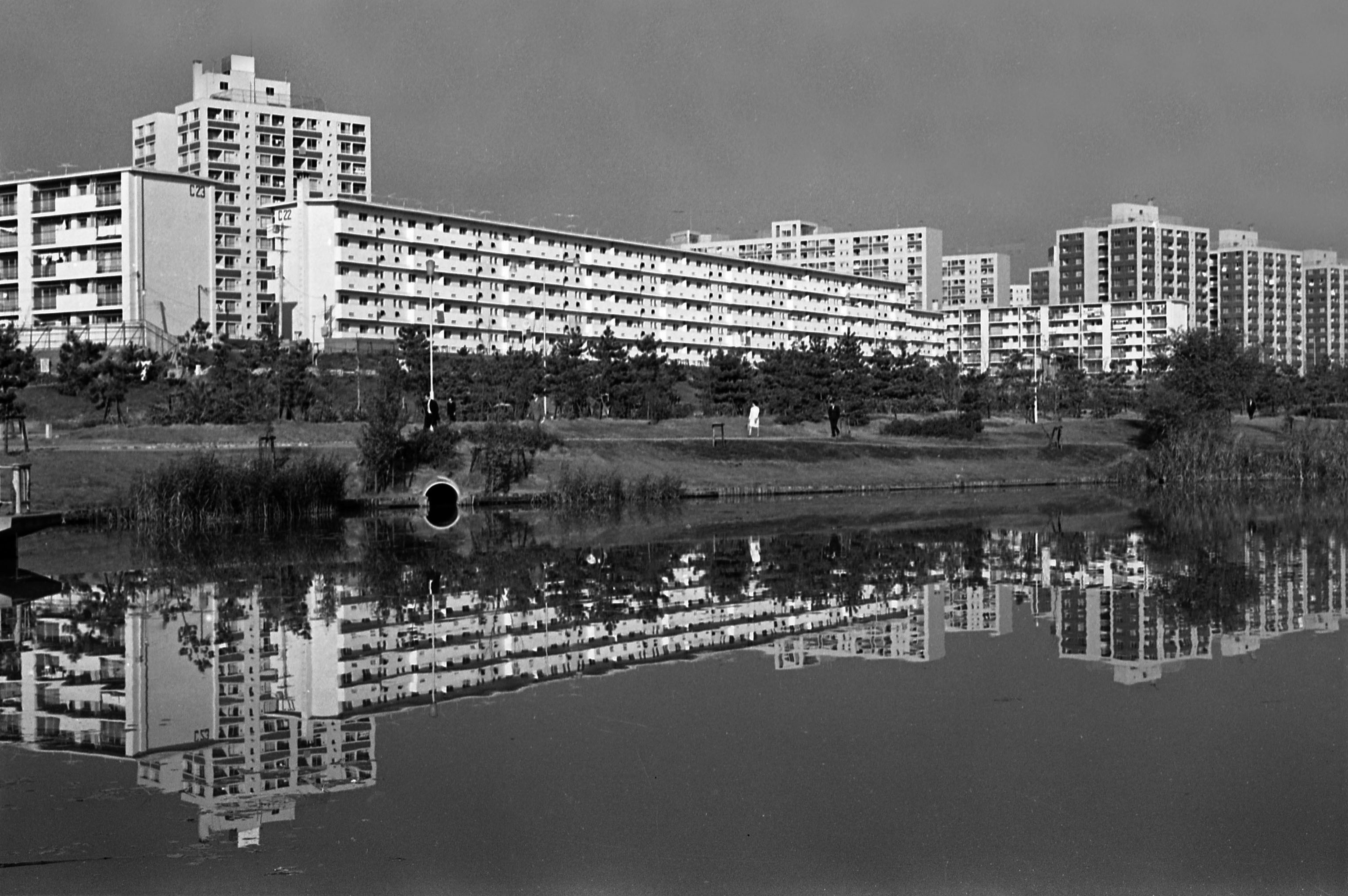 内容・説明 | 朝の千里南公園。竹見台公団住宅が牛ヶ首池に映る。この団地ではさまざまな住棟配置が試行され、写真中央のC22棟は千里ニュータウンで一番長い住棟となった(階段室が8つ連続している)。 |