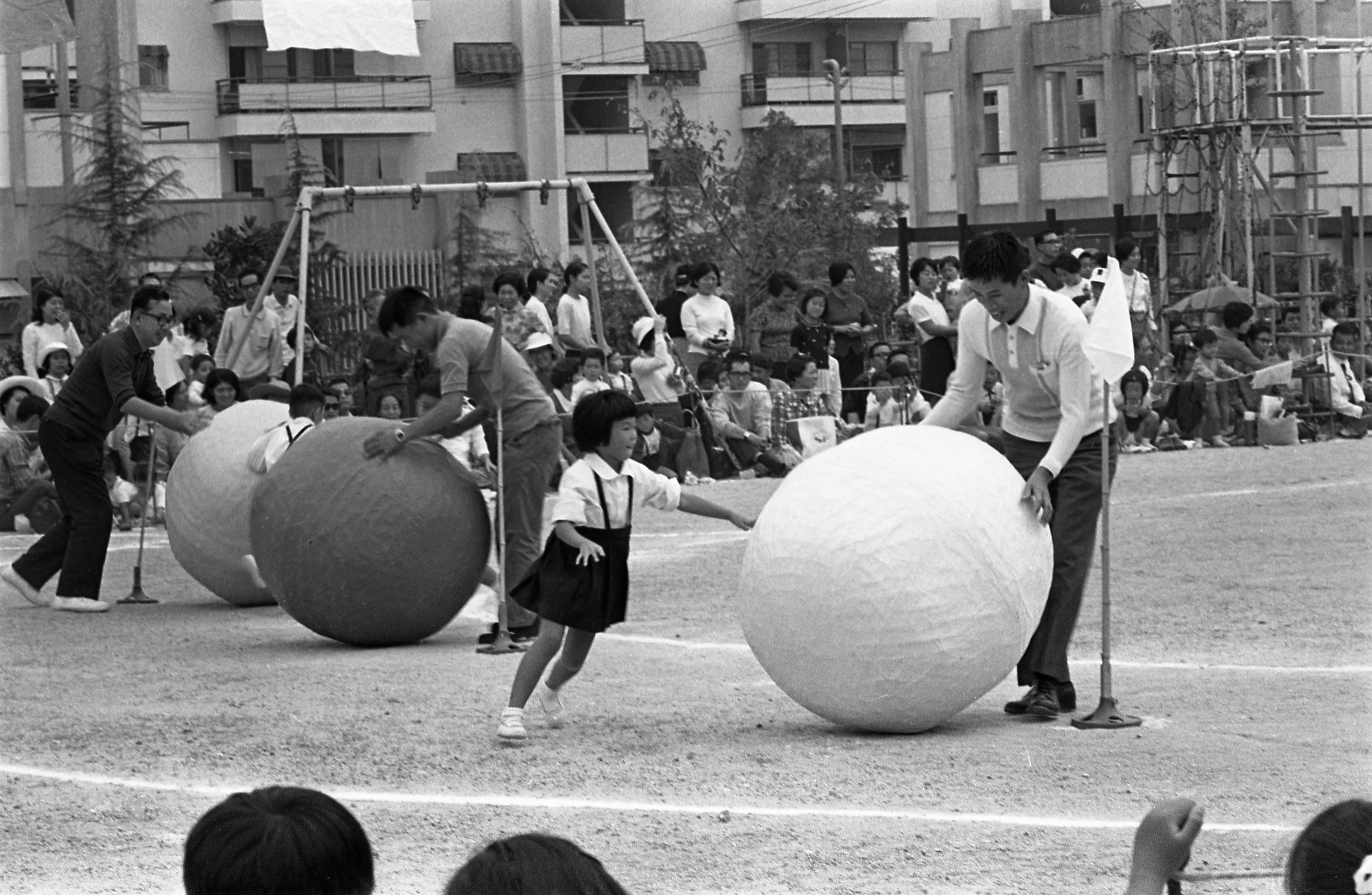 | 内容・説明 | 新千里東町、アソカ幼稚園での運動会。大玉転がし。背後には三丁目府営住宅(B2棟)、その間に診療所が見える。 |