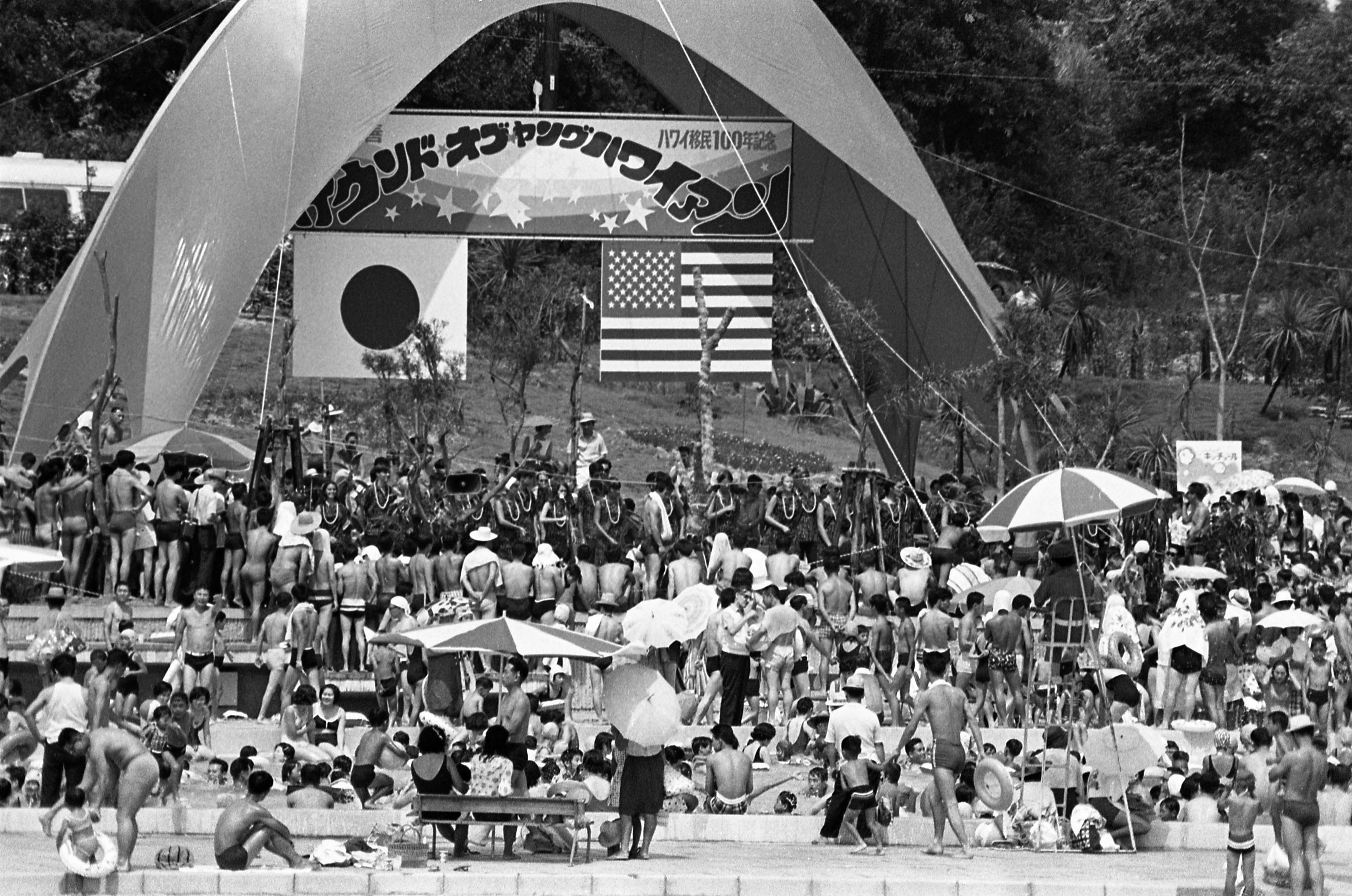 | 内容・説明 | ハワイ移民100年記念として北公園プールで行われた「サウンド・オブ・ヤング・ハワイアン」。ずいぶん派手なアーチが立っている。 |