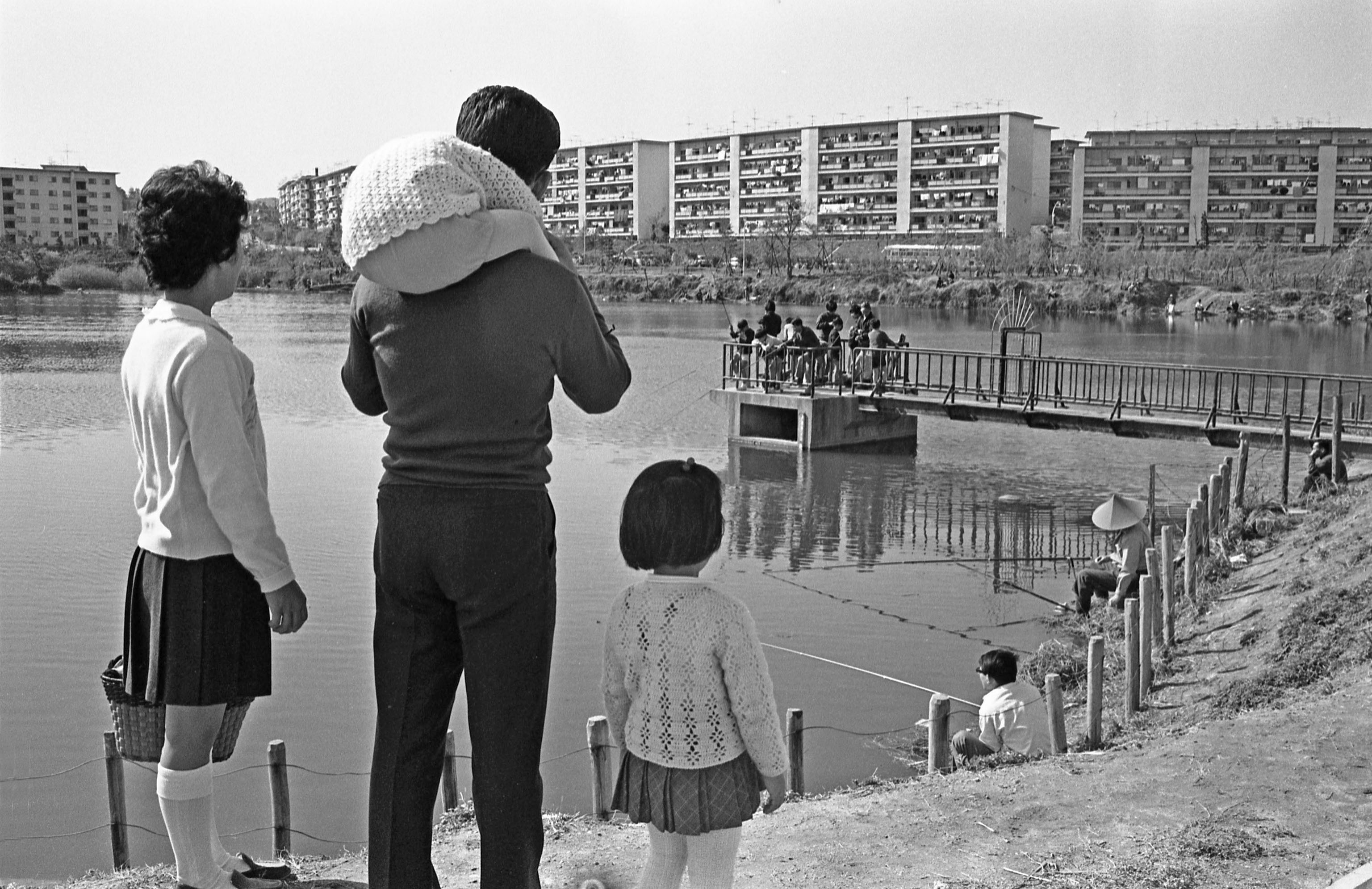 内容・説明 | 新千里北町、樫ノ木公園の樫ノ木池。背後は二丁目の府営住宅。釣り人が見られるが杭がすでに立てられていて、立入禁止になる直前のようだ。 |