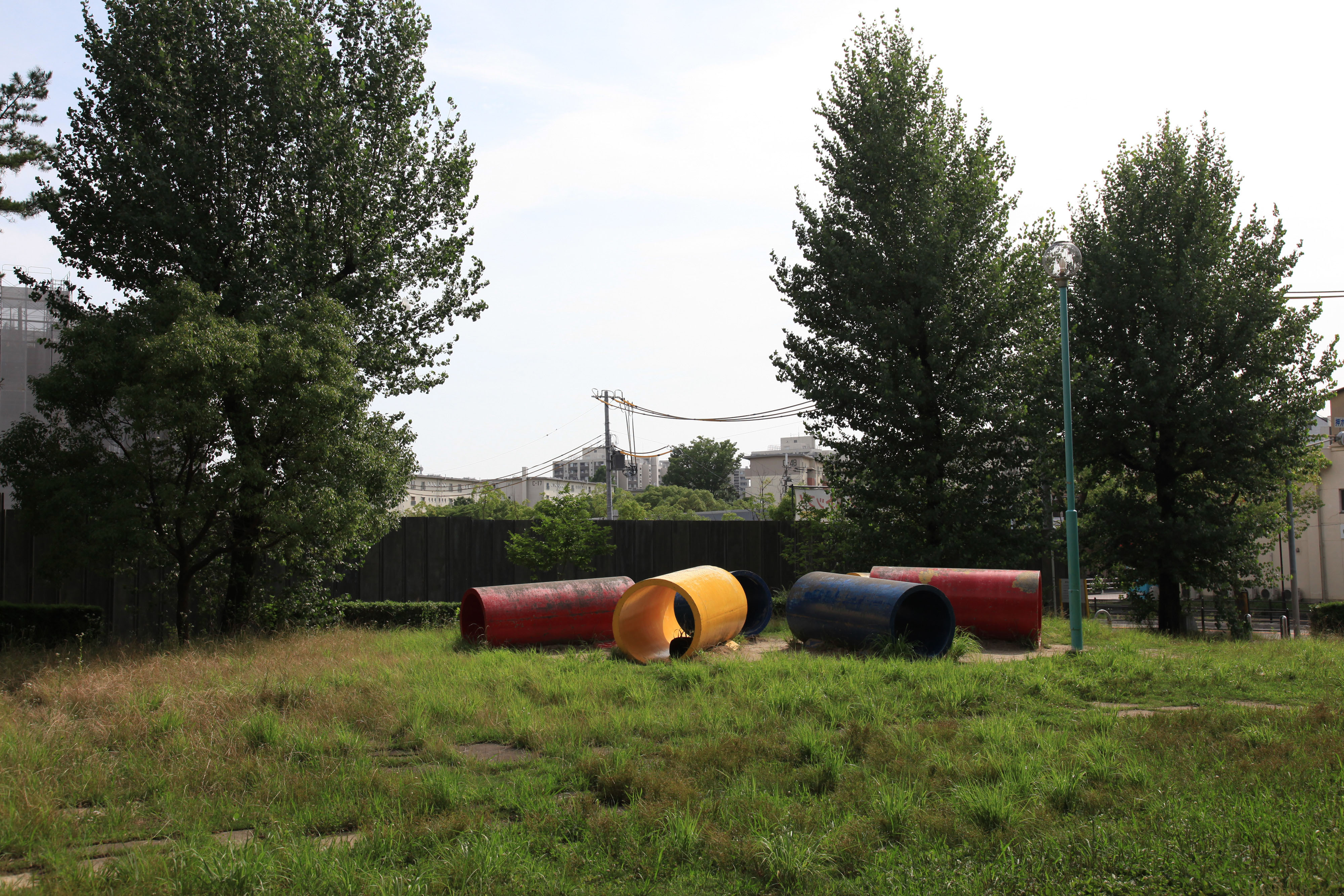 | 内容・説明 | 津雲公園の土管をカラフルに塗った遊具。背後では公社団地の建替が進む。 |