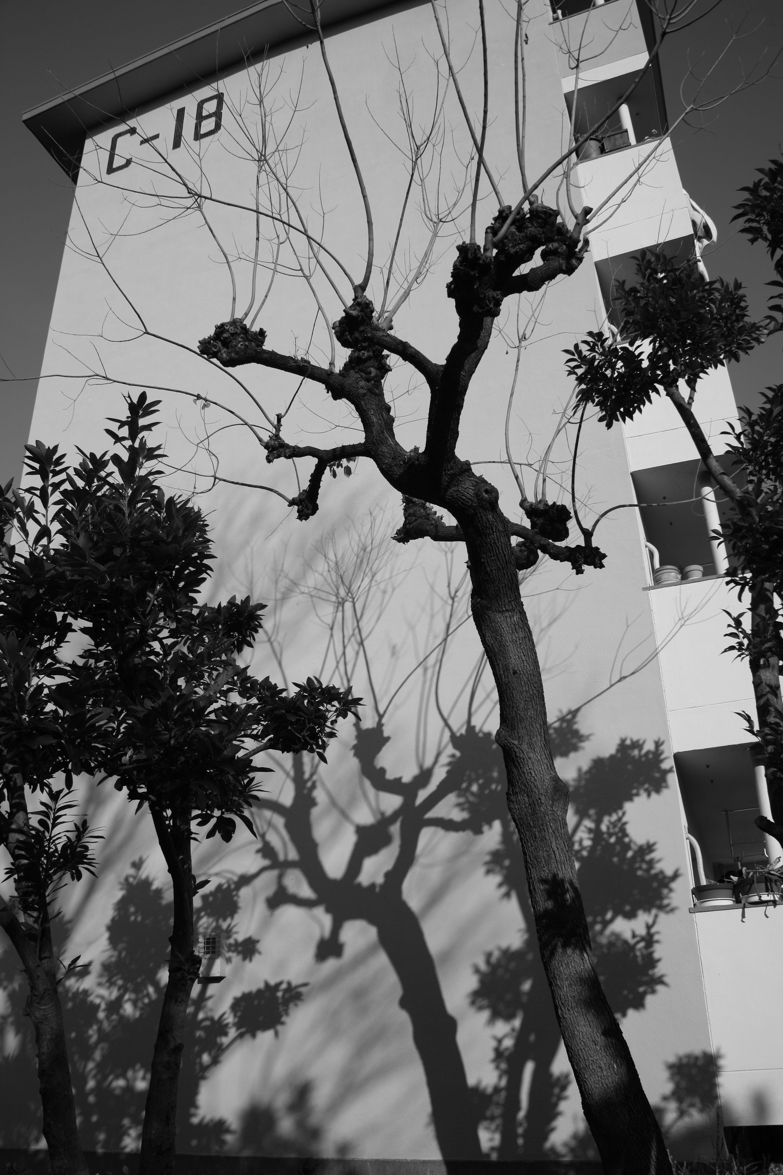 | 内容・説明 | 津雲台二丁目。UR団地C18棟。葉っぱを落とした街路樹が妻面に影を描く。 |