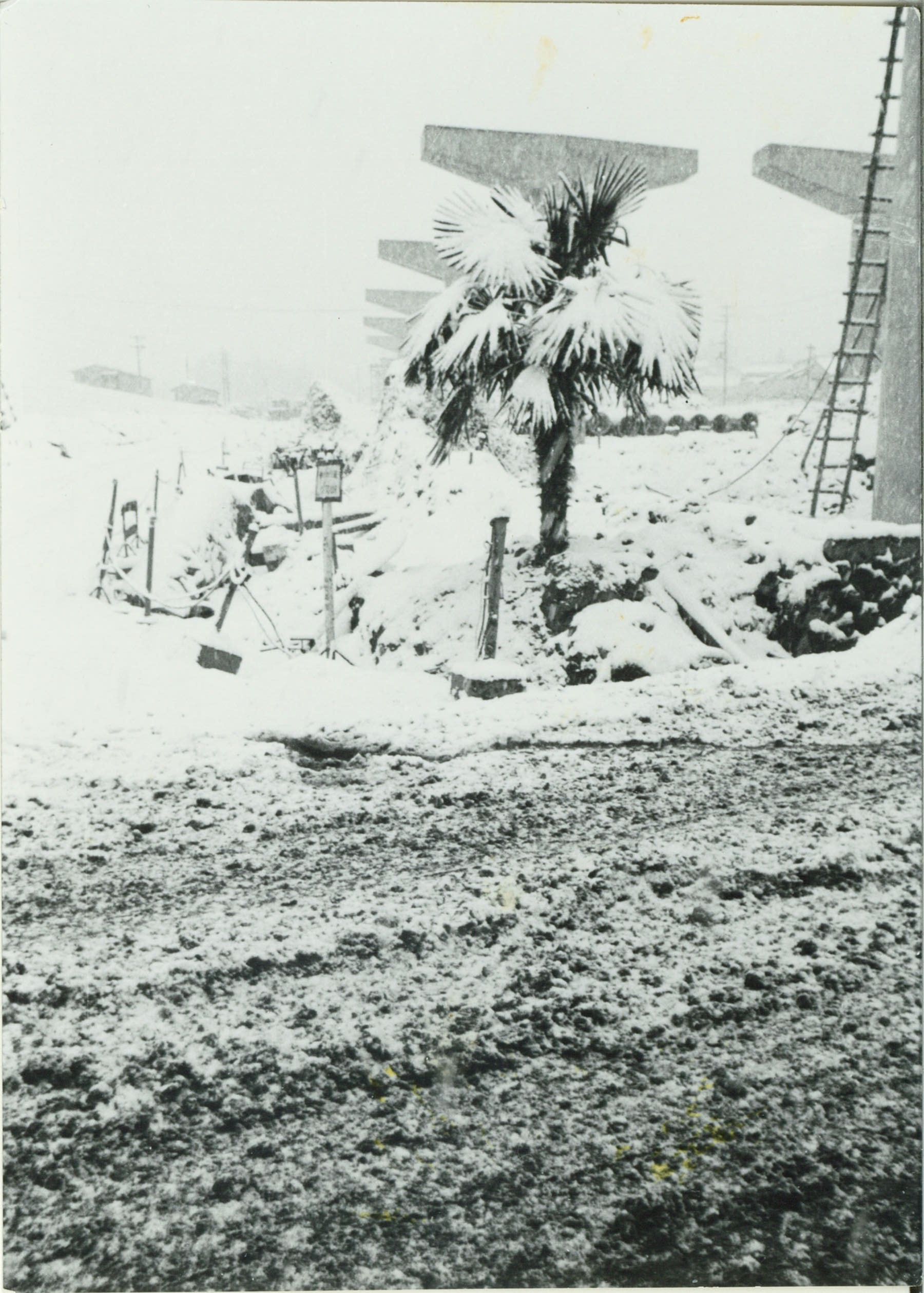 内容・説明 | 大阪には珍しい雪が積もった日の柴原口付近です。 昭和40年(1965年)の3月、大阪に記録的な大雪が降りました。 16日の夜、近畿、四国地方に降り始めたみぞれは大粒のぼたん雪になって降り積もり、3月に雪が降るだけでも珍しいのに、翌朝の積雪は12cm。これは観測史上、当時で4番目、平成26年10月現在でも積雪ランキングの、5番目となるほどです。 17日の通勤ダイヤは大混乱、電話の送電所が故障して一部が不通、停電などもあったようで、市民生活に大きな影響を及ぼしました。 当日の朝日新聞の原紙が今も岡町図書館に保存されており、「雪の大阪城を背景に記念撮影をする修学旅行の高校生」「淀川堤防で体育時間に雪ダルマづくりに興じる柴島中学の女生徒」の写真や「白一色 春はどこへ?」「雪に流された春闘」「公立高校入試も昼から 大阪」などの大きな見出しの記事が見られます。 こちらの写真の撮影日は「昭和40年の冬」ということだけで、正確な月日は不明ですが、もしかしたらこの記録的な春雪の日だったのかもしれません。 写真の右側、雪に覆われた木の向こう側に建設中の中国自動車道の橋脚が並んでいるのが見えています。画面左側、道がゆるくカーブしているのがおわかりでしょうか。 |