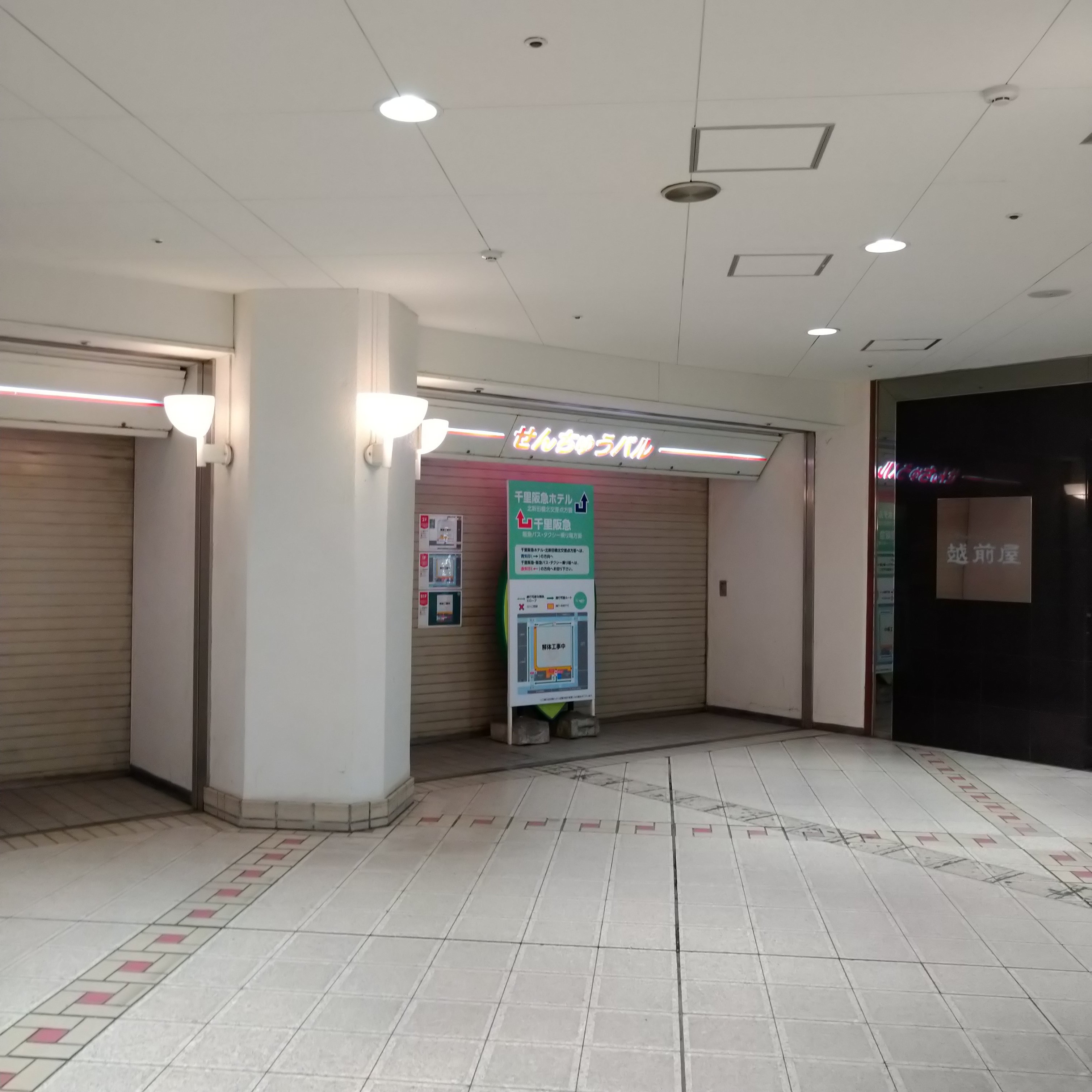 内容・説明 | セルシー2の撮影から1週間後の千里阪急百貨店側。 白い柵で覆われている。 せんちゅうぱる南エリアの1階、 大阪モノレール側から千里阪急百貨店側へ抜ける通路は 工事のため封鎖された。 この通路には、レコード店、文房具店、画材・美術専門店、 薬局、美容院などがあった。 |