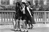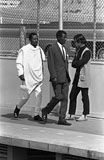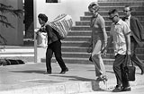 [SK13406] 北新田橋たもとで、万国博スタッフと思われる外国人と「担ぎ屋」のような女性。ニュータウン初期には、食料や衣料を生産地から担いできて売る行商人も見られた。違う世界が交錯する。