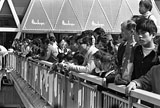 [SK13440] 千里中央地区センターで、サンタウン(現在の「せんちゅうパル」)1周年のパレードを歩道橋の上から見る人たち。奥が千里阪急。