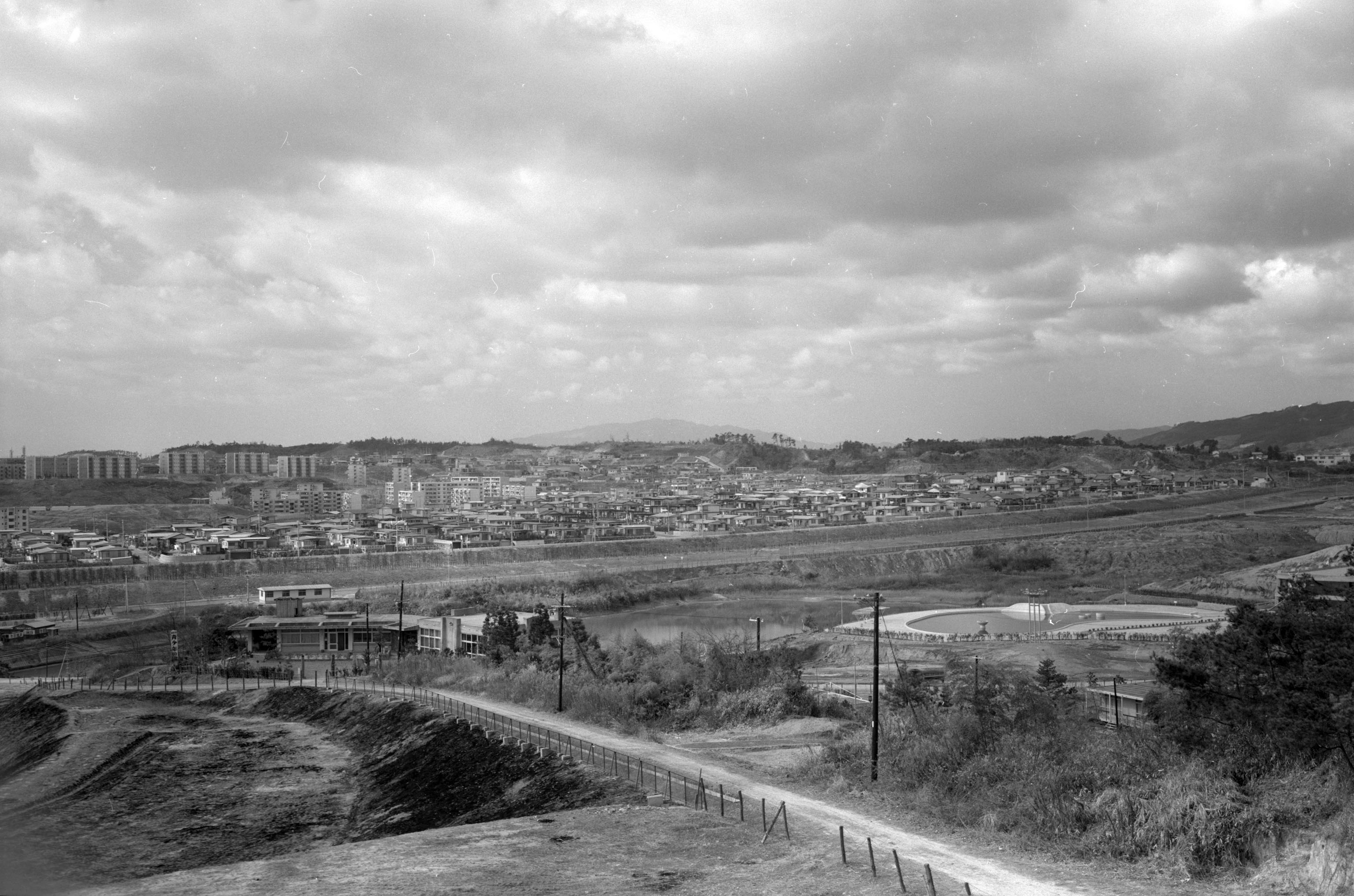 | 内容・説明 | 千里北公園の小野原に抜ける高台から、青山台方面を望む。青少年野外活動センター(のちの自然体験交流センター)、プールはひょうたん型プールだけが出来ている。 |