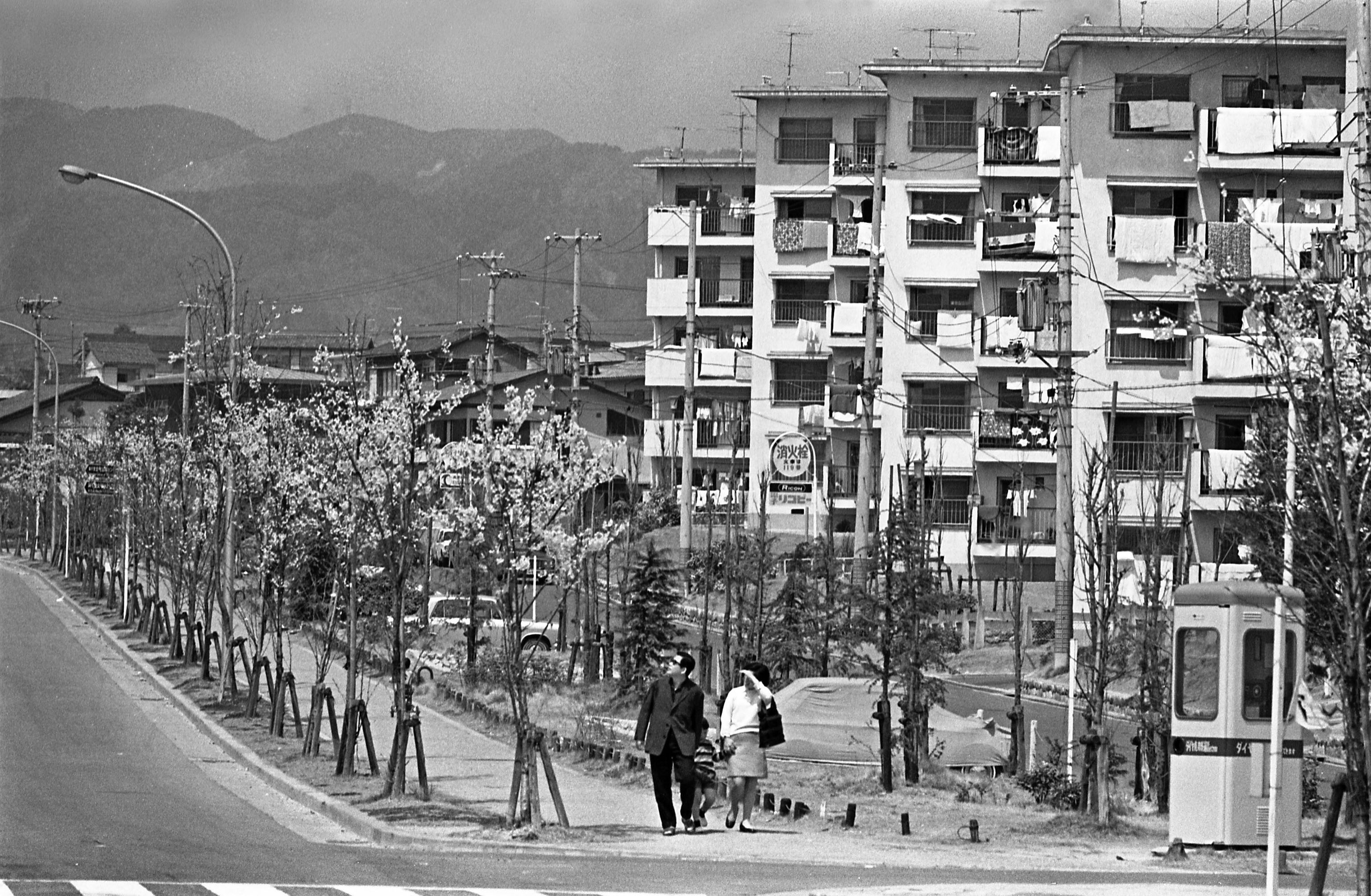 | 内容・説明 | 青山台公団住宅と、千里中央筋(千里中央線、千里さくら通り)の桜並木。右端に公衆電話ボックス(頭が赤い丹頂タイプ)が見えている。 |