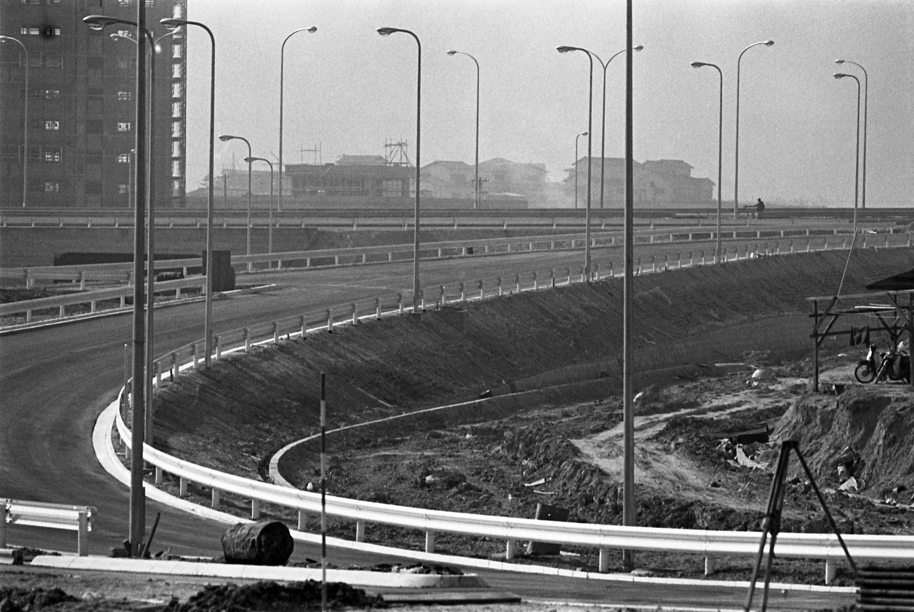| 内容・説明 | 千里インターチェンジ建設中。街路灯が立ち並んで都会的になってきた。万博開催まで、あと2ヵ月しかない。奥は新千里南町。公社高層A1棟も建設中。 |