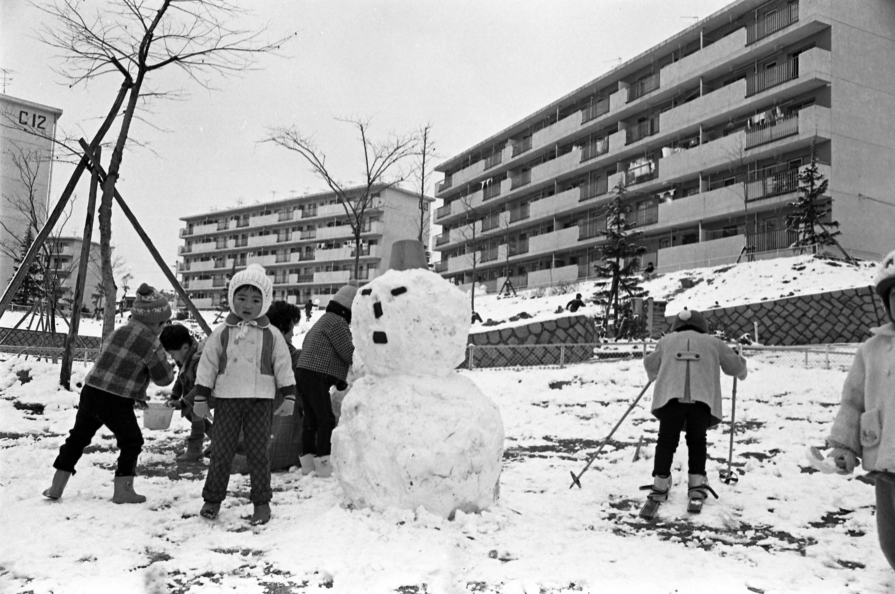 | 内容・説明 | 北町一丁目公団住宅で、積もった雪にはしゃぐ子どもたち。左からC12、C7、C13、C14棟。 |