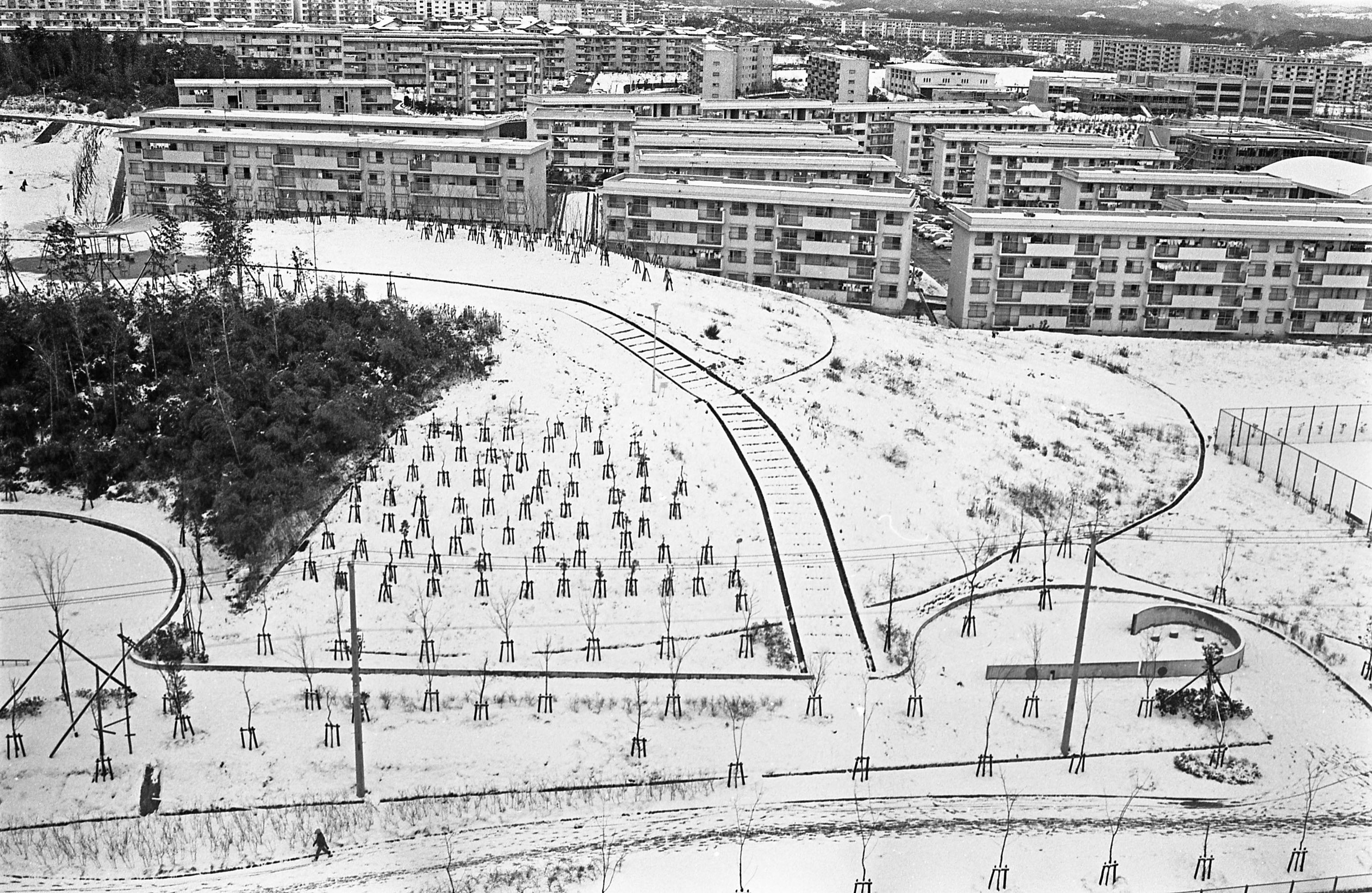| 内容・説明 | 雪の新千里東町公園。南側の公団高層C29棟から、公園越しに公社分譲深谷第三住宅群を見下ろす。 |