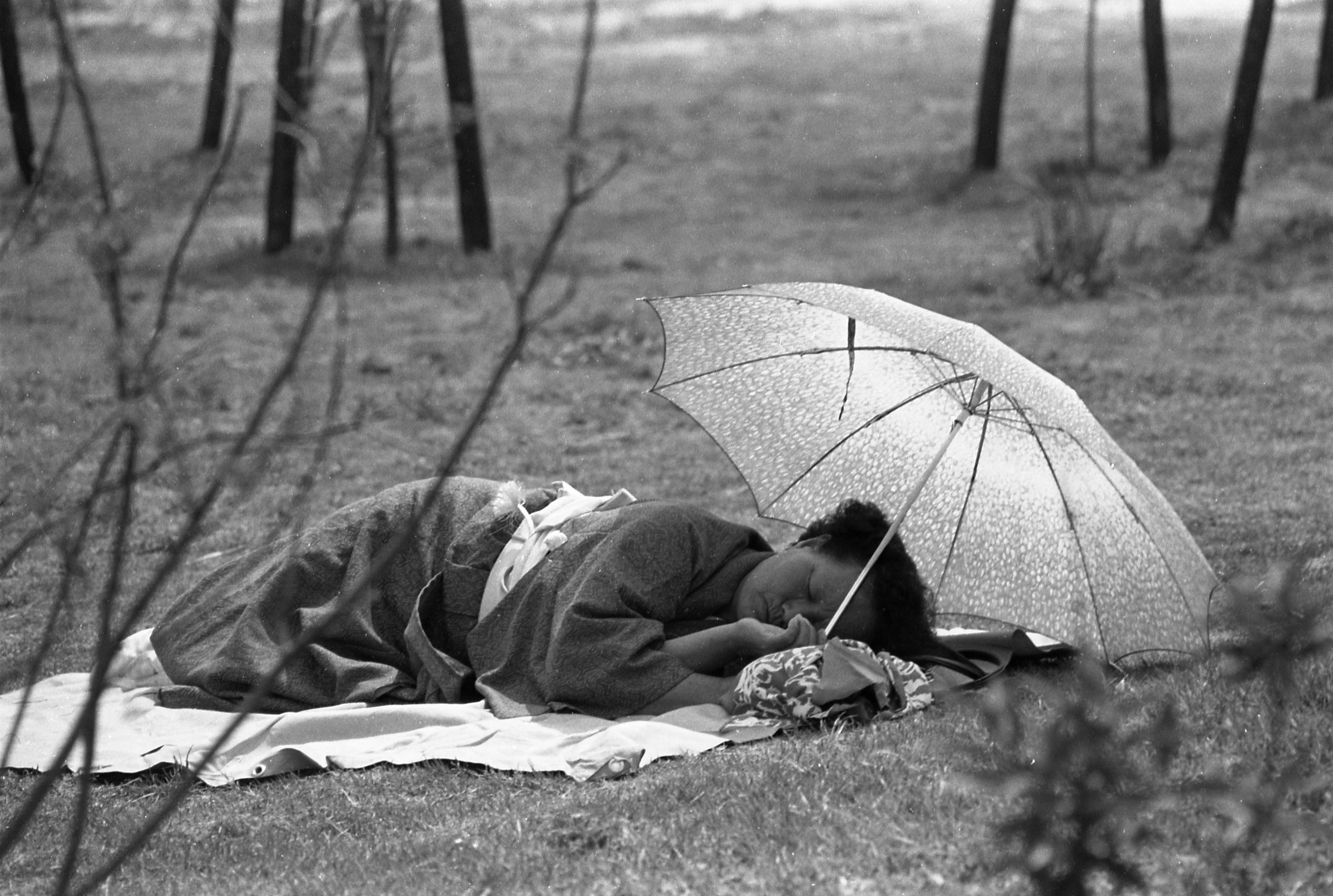 | 内容・説明 | 千里南公園で大型連休に行われていた「せんりこどもカーニバル」で。芝生の上で着物を着て日傘をさして眠る女性。 |