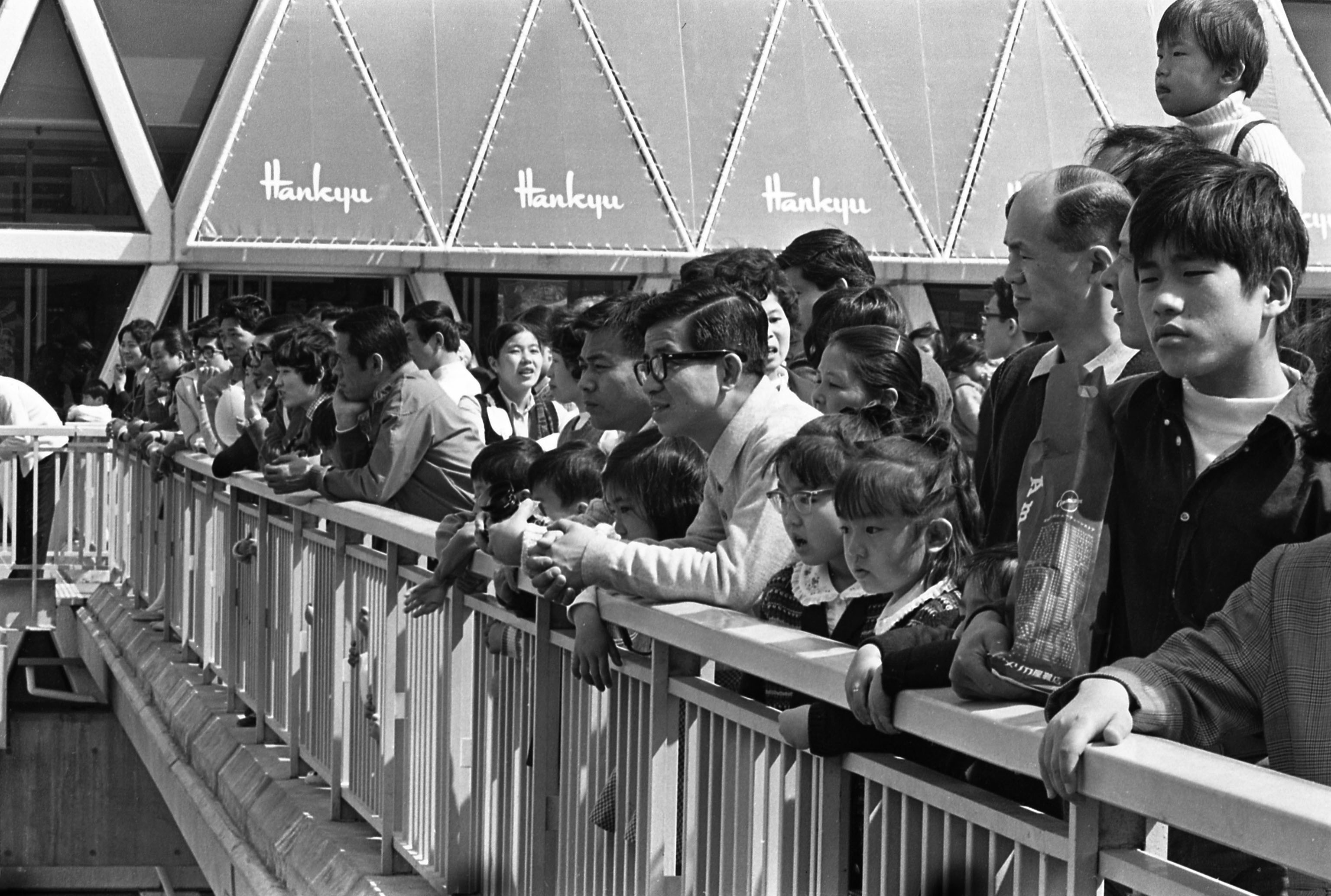 内容・説明 | 千里中央地区センターで、サンタウン(現在の「せんちゅうパル」)1周年のパレードを歩道橋の上から見る人たち。奥が千里阪急。 |