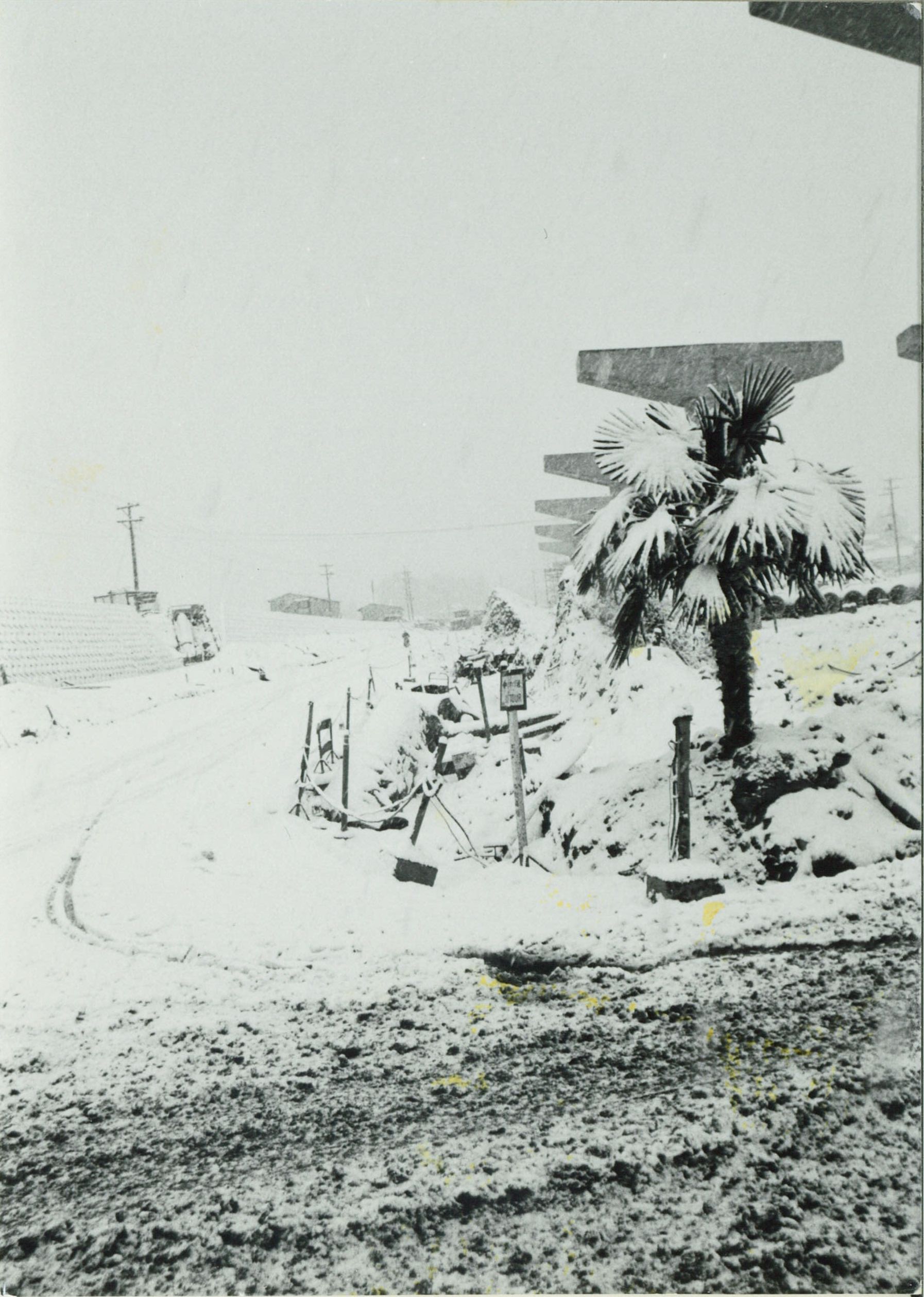 内容・説明 | 大阪には珍しい雪が積もった日の柴原口付近です。 昭和40年(1965年)の3月、大阪に記録的な大雪が降りました。 16日の夜、近畿、四国地方に降り始めたみぞれは大粒のぼたん雪になって降り積もり、3月に雪が降るだけでも珍しいのに、翌朝の積雪は12cm。これは観測史上、当時で4番目、平成26年10月現在でも積雪ランキングの、5番目となるほどです。 17日の通勤ダイヤは大混乱、電話の送電所が故障して一部が不通、停電などもあったようで、市民生活に大きな影響を及ぼしました。 当日の朝日新聞の原紙が今も岡町図書館に保存されており、「雪の大阪城を背景に記念撮影をする修学旅行の高校生」「淀川堤防で体育時間に雪ダルマづくりに興じる柴島中学の女生徒」の写真や「白一色 春はどこへ?」「雪に流された春闘」「公立高校入試も昼から 大阪」などの大きな見出しの記事が見られます。 こちらの写真の撮影日は「昭和40年の冬」ということだけで、正確な月日は不明ですが、もしかしたらこの記録的な春雪の日だったのかもしれません。 写真の右側、雪に覆われた木の向こう側に建設中の中国自動車道の橋脚が並んでいるのが見えています。画面左側、道がゆるくカーブしているのがおわかりでしょうか。 |