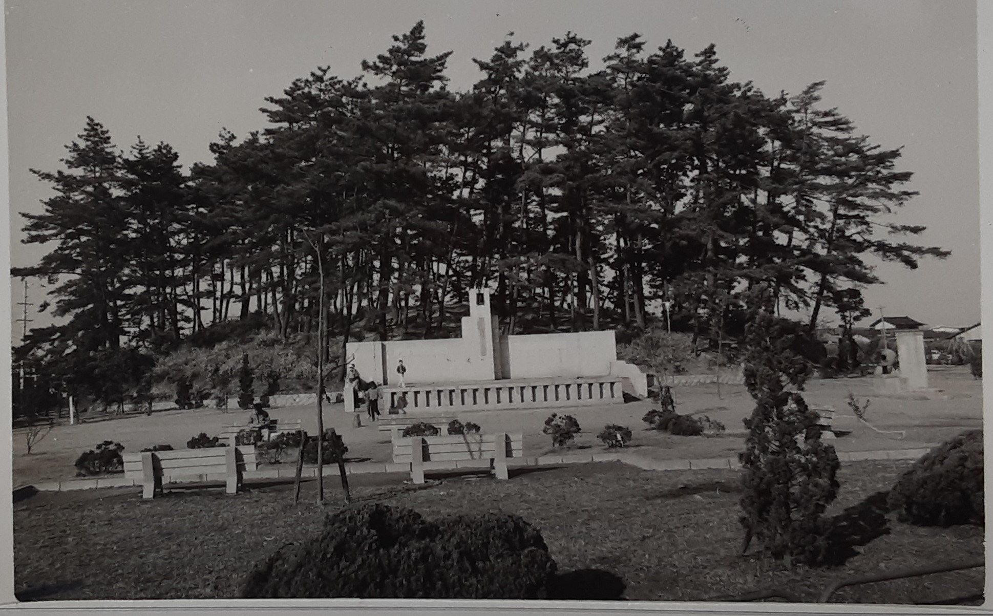 | 内容・説明 | 大塚古墳を背にした白くうつる舞台がラジオ塔です。舞台の背面に、第一土地区画整理組合記念碑がありました。碑文には、昭18(1943)年4月に建之とあります。 現在は舞台は存在しません。碑文は現在の大塚公園銘板の裏面にはめ込まれています。 ---- 出典:新修豊中市史 通史二「豊中の空襲」 |