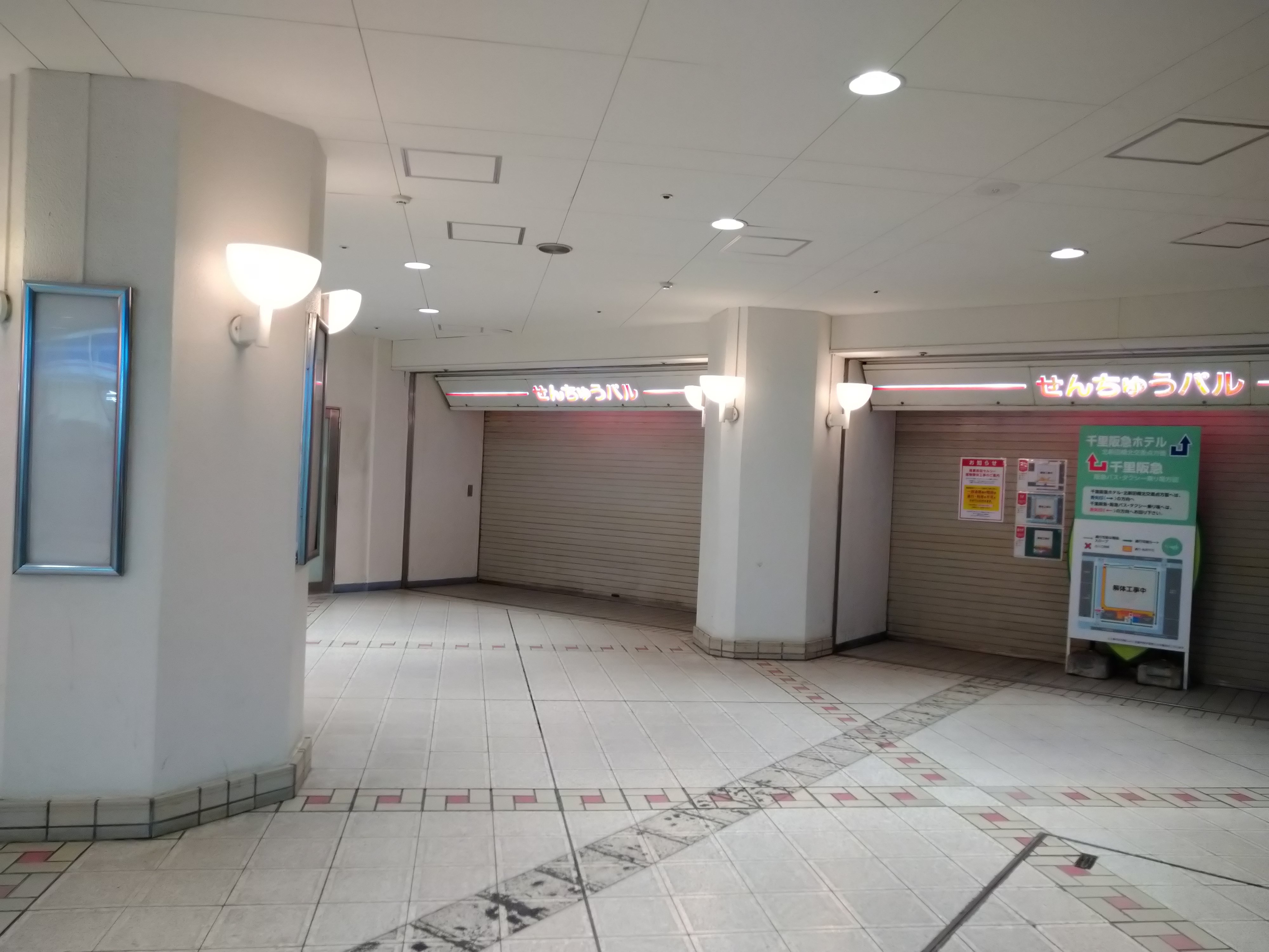 内容・説明 | セルシー2の撮影から1週間後の千里阪急百貨店側。 白い柵で覆われている。 せんちゅうぱる南エリアの1階、 大阪モノレール側から千里阪急百貨店側へ抜ける通路は 工事のため封鎖された。 この通路には、レコード店、文房具店、画材・美術専門店、 薬局、美容院などがあった。 |